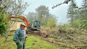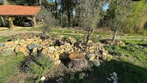 Removing several tree stumps and clearing accumulated debris – this was done by farmer and neighbour George – allowed us to re-establish an orchard around a very old apple tree, a remnant of the former orchard meadow. New fruit trees were selected for their adaptation to the local sandy clay soil. These include various varieties of apple, pear, cherry, and plum trees, as well as chestnut, almond, and fig trees.
