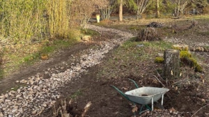 The original path layout included a loop circling a central island with three oak trees overhanging the houses (removed in October), as well as several hazelnut trees growing among piles of rocks, pebbles, and former construction rubble.