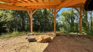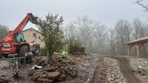 In preparation for a clearly defined pebbled parking area, oak sleepers were installed, chestnut wood barriers were erected, and the ground was levelled. In July, an initial 12 tonnes of pebbles were delivered and laid over the parking area. This will be complemented at a later stage by additional layers of smaller pebbles.