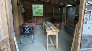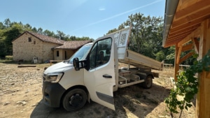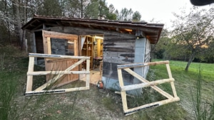 Initiated shortly after settling into the property, the installation of the workshop awaited the securing of the electrical circuits, which then enabled further improvements, including the installation of plexiglass windows and curtains. The workshop is now fully operational and has been instrumental in the construction of the rustic double-leaf chestnut property gate and other DIY projects.