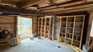Early tasks therefore focused on clearing excess trees and shrubs around the main house to restore light and airflow, as well as furnishing the interior. The open-plan ground floor was temporarily converted into a workshop for renovating antique wooden furniture, while a steady stream of deliveries followed, including electrical appliances, bedding, and light fixtures.